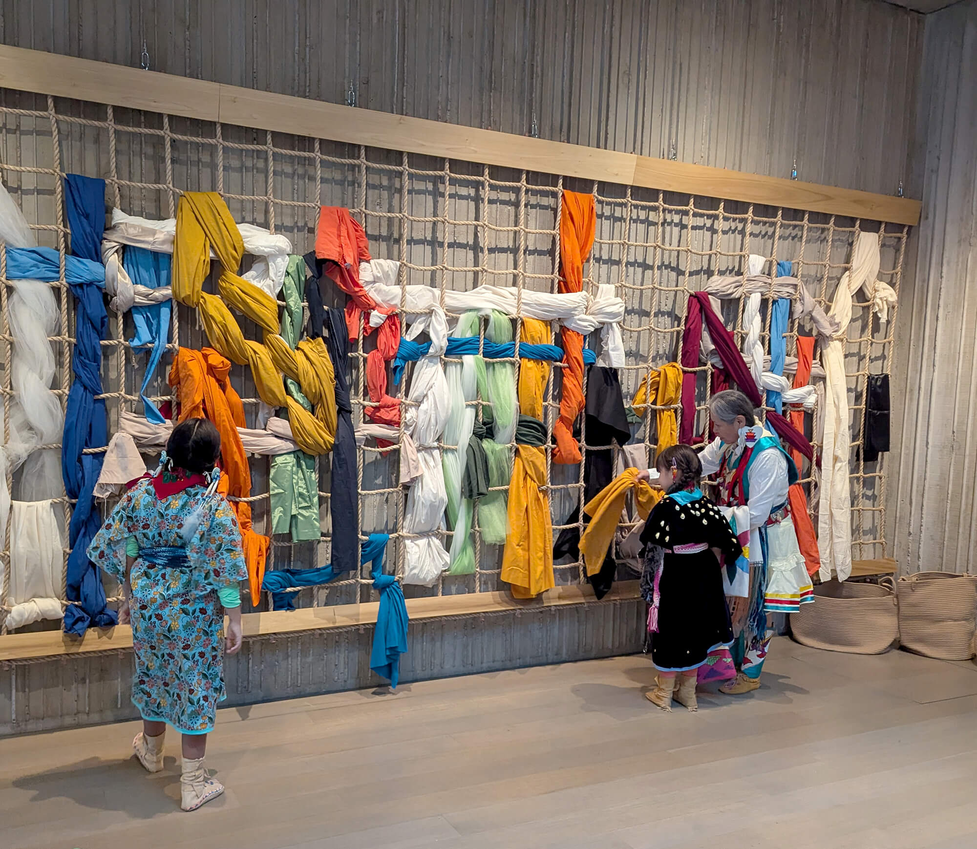 Developed in conjunction with Colville students and artist Carly Feddersen, the community weaving experience is inspired by the weaving techniques used by Feddersen and the colors Clyfford Still used to paint PH-796, which our co-curator, Kloey, likened to a woven blanket. Start by choosing materials from the hooks in this gallery, and then find a spot to weave on the interactive wall. Try different ways to weave the material through the rope. You can add to someone else’s weaving or undo a weaving to make space for your design!